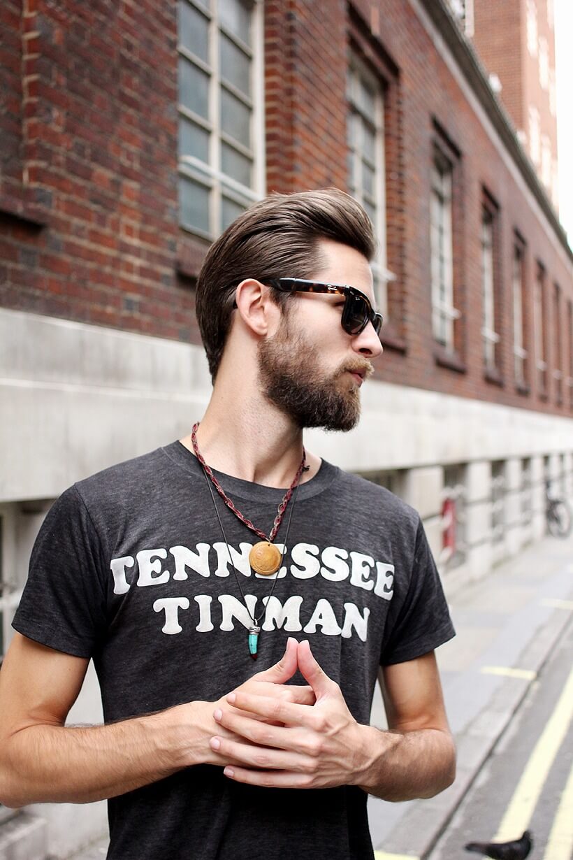 This men’s pompadour haircut is for gentlemen rather than rock stars. The hair on the sides is undercut, and the longer hair on the top is brushed back, adding to the style with a well-kept beard. The hair on the top is cut to such a length that is below the crown and this haircut can match most shapes of the face.
